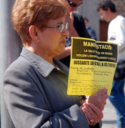 En nom de la Plataforma, Ignacio Barquín va expressar que “aquests anuncis sobre retallades, justificats amb la crisi, estan fent que la població cregui que no es pot fer res, hem de continuar reivindicant”. Per la seva banda, un portaveu de la Plataforma, Carles Escolà va llegir el manifest de la Plataforma davant dels assistents, un text que, entre d’altres, insta l’administració a que no es doni la gestió de la sanitat a entitats amb ànim de lucre, que no es justifiqui de cap manera l’externalització dels serveis i que s’escurcin les llistes d’espera, que no es desgravin impostos a qui paga una assegurança privada perquè “no volem una sanitat per a rics i una beneficència per a pobres” i que no s’implanti un sistema de copagament, taxes o tiquets moderadors per limitar l’accés de la població a la xarxa sanitària.
