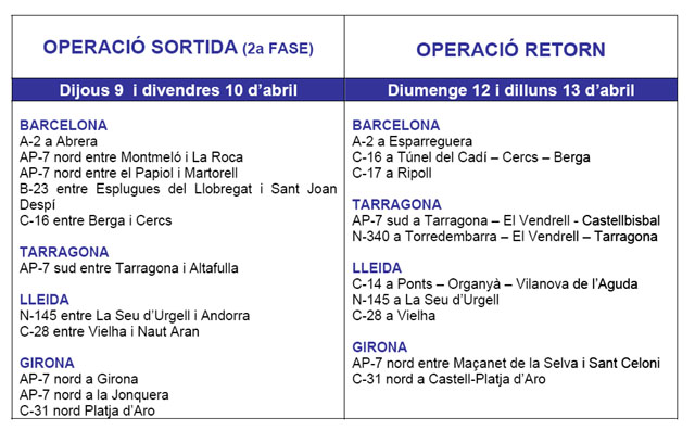 Avui al migdia començarà la segona fase de l’operació sortida de Setmana Santa en què es preveu que 350.000 vehicles abandonin l’Àrea Metropolitana de Barcelona (AMB). El dispositiu especial del Servei Català de Trànsit (SCT) es concentrarà entre avui a partir de les 15.00 hores i dilluns, 13 d’abril, a les 24.00 h.