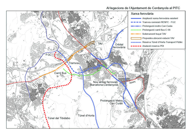 Pel que fa als diferents projectes que afecten Cerdanyola, pel que fa a la xarxa ferroviària el PITC contempla la possibilitat d'un túnel d'Horta ferroviari a través del projecte Ampliació de la connexió ferroviària a Barcelona des del Vallès, però s'hauria de determinar amb més detall aquest projecte dina la revisió del Pla Director d'Infraestructures (PDI). La planificació també parla d'un tren-tramvia per al Vallès Occidental de forma inconcreta on, apunta Serracant, potser s'inclou Cerdanyola, i del ramal d'alta velocitat del Vallès amb un pressupost de 340 milions d'euros i de l'adaptació de la via Castellbisbal-Mollet -per on passa la línia C7- a l'ample internacional.
