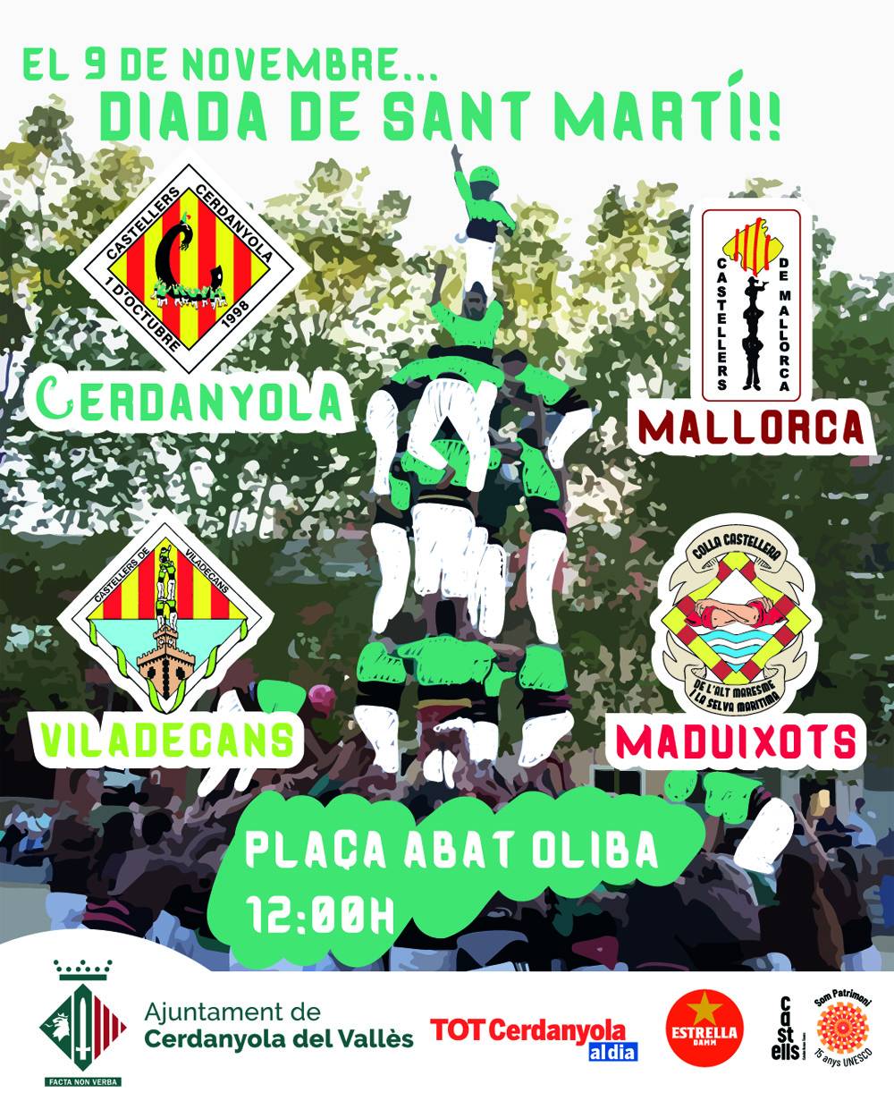 7 de novembre de 2025 a les 21:55Els Castellers de Cerdanyola celebren la tradicional Diada de Sant Martí diumenge dia 9 a la plaça de l’Abat Oliba i a partir de les 12h. Estaran acompanyats dels Castellers de Mallorca, els Castellers de Viladecans i els Maduixots de l’Alt Maresme i la Selva Marítima.