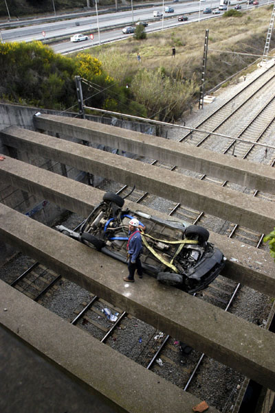 Un cotxe, va quedar literalment empotrat entre les bigues que suporten les sortida del túnel de la renfe, al seu pas per sota de la carretera que enllaça Cerdanyola amb la UAB, a l'alçada de la sortida de la B-30 cap a Cerdanyola.