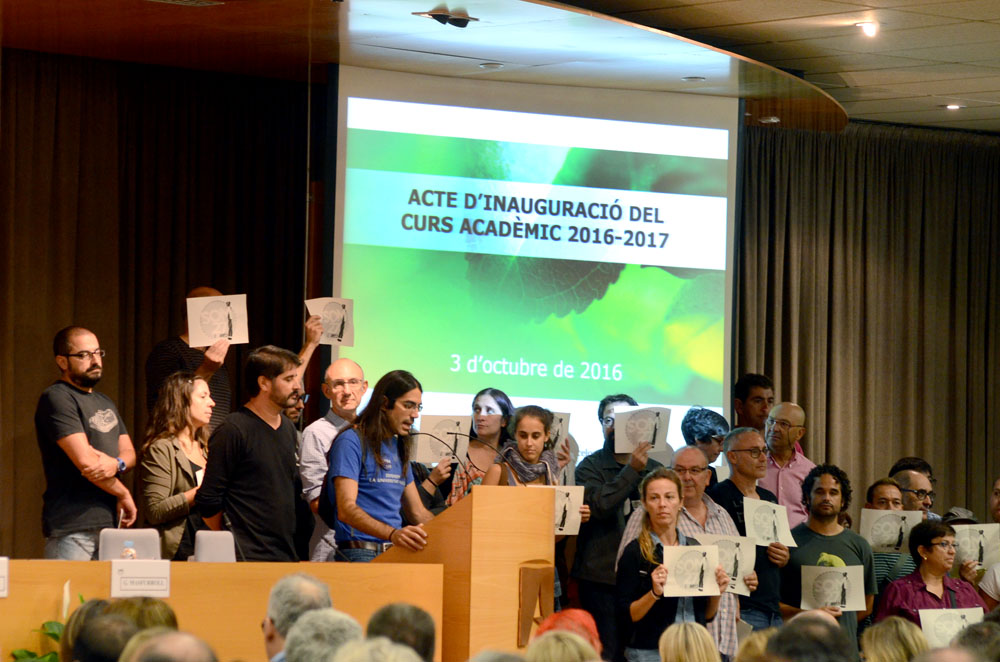 L'acte es va iniciar amb la lectura d'un comunicat dels representants del personal docent i d'administració de la UAB que exigeix la retirada de totes les acusacions relacionades amb l'ocupació del Rectorat de l'any 2013, amb 25 estudiants, un professor i un membre del Personal d'Administració i Serveis encausats amb una petició global de més de 325 anys de presó per part de la Fiscalia.