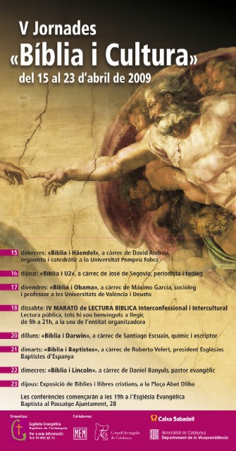 "L’Església Evangèlica Baptista de Cerdanyola celebrarà la cinquena edició de les jornades ’Bíblia i Cultura’ entre els dies 15 i 23 d’abril. Els seus responsables destaquen l’objectiu d’aquesta iniciativa \""d’evidenciar l’estreta relació entre la cultura occidental en les seves diverses manifestacions artístiques, històriques, filosòfiques, científiques o polítiques i la influència cristiana\""."