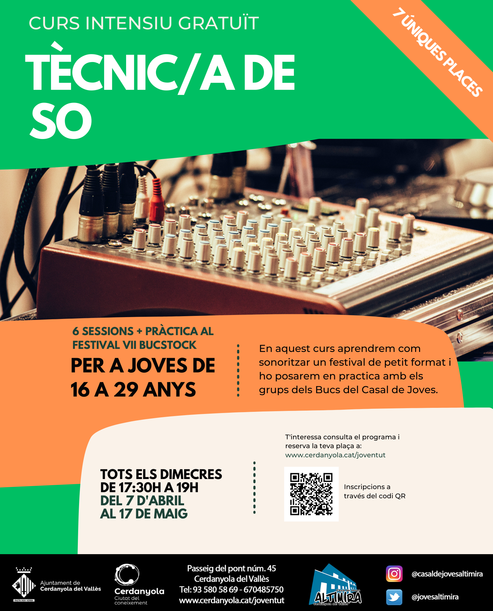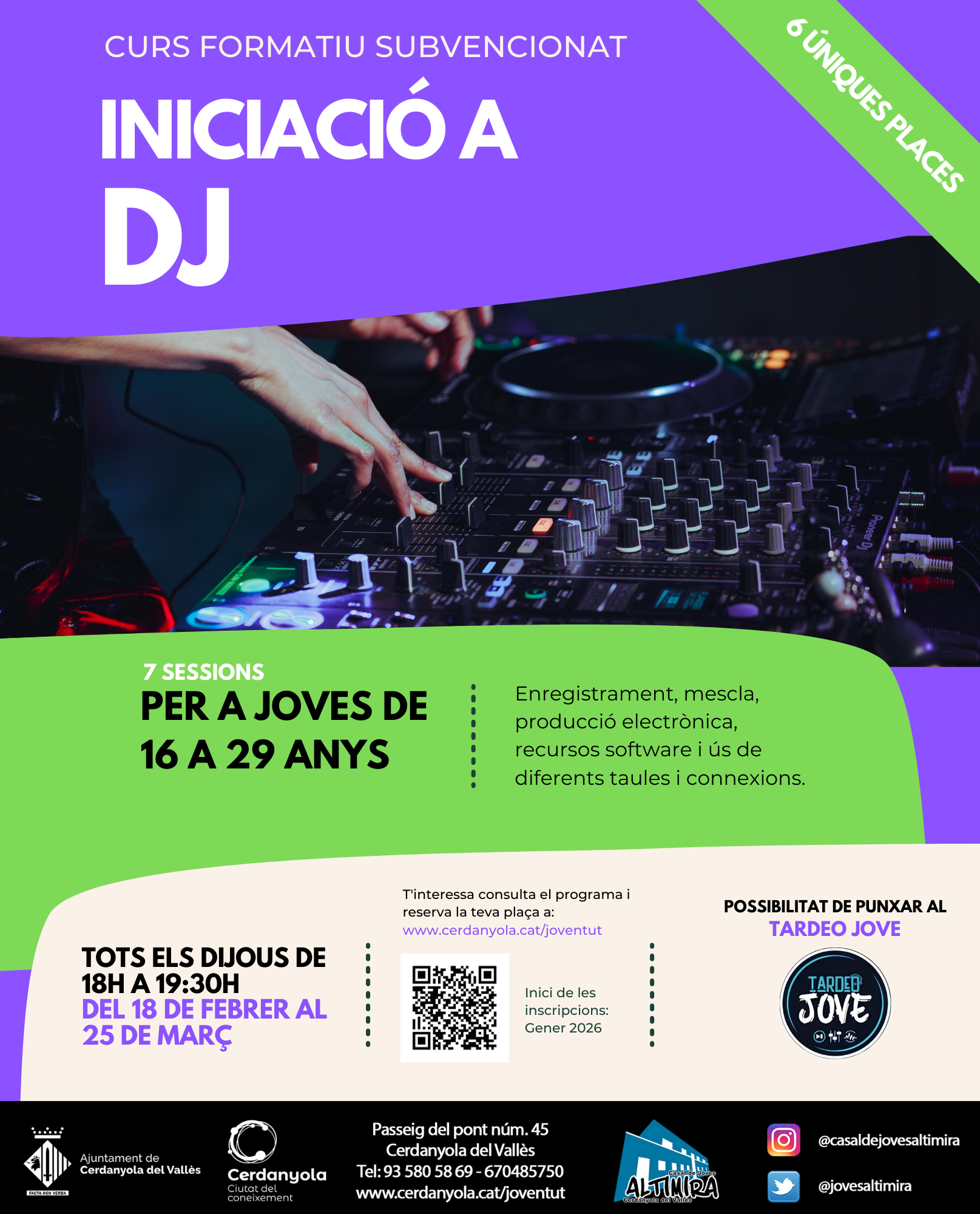 Són cursos gratuïts per a les persones joves i grups que assagen al casal, amb places molt limitades (6-7 participants per grup), amb una orientació molt pràctica i vinculada a l’ús real de l’estudi i a esdeveniments municipals (en el cas del curs de DJ, amb possibilitat de punxar al Tardeo Jove i en el de tècnic/a de so podran sonoritzar el Bucstock, festival de petit format al Casal de Joves).
