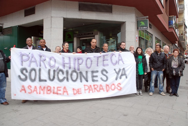 Una vintena de persones han protestat aquest matí davant l’oficina de Caja Madrid del carrer de Lluís Companys per intentar aturar el procés de subhasta del pis d’un veí a Badia del Vallès. L’afectat, Fufana, està a l’atur, té família a càrrec i té un deute de 103.000 euros amb l’entitat per no fer front a les quotes hipotecàries des de fa 24 mesos.