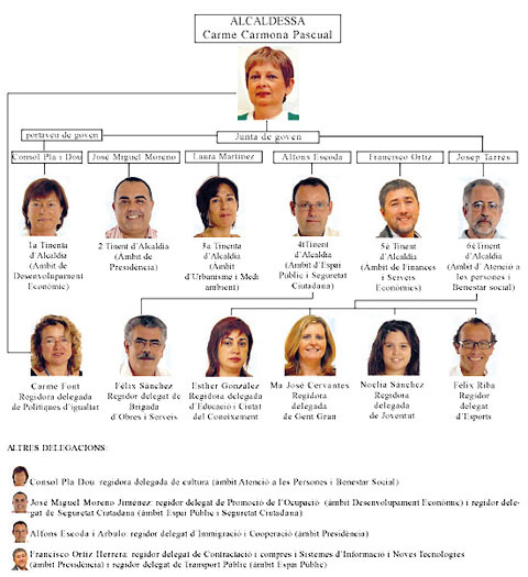 El primer que va fer el nou govern va ser, òbviament, presentar-se en societat. El Partit dels Socialistes de Catalunya i Convergència i Unió, amb la majoria estable que donen 13 regidors, estructuraven el govern en 5 grans àrees: Alcaldia - Presidència; Atenció a les Persones i Benestar Social; Urbanisme i Medi Ambient; Finances, Serveis Econòmics i Desenvolupament Econòmic Local; i d'Espai Públic i Seguretat Ciutadana. L'alcaldessa, Carme Carmona, rep una retribució bruta anual de 60.732 euros i els regidors amb dedicació exclusiva 49.962 euros mentre que es destinen retribucions que van des 14.060 al 37.069 euros per als regidors amb dedicació parcial segons les hores assignades.